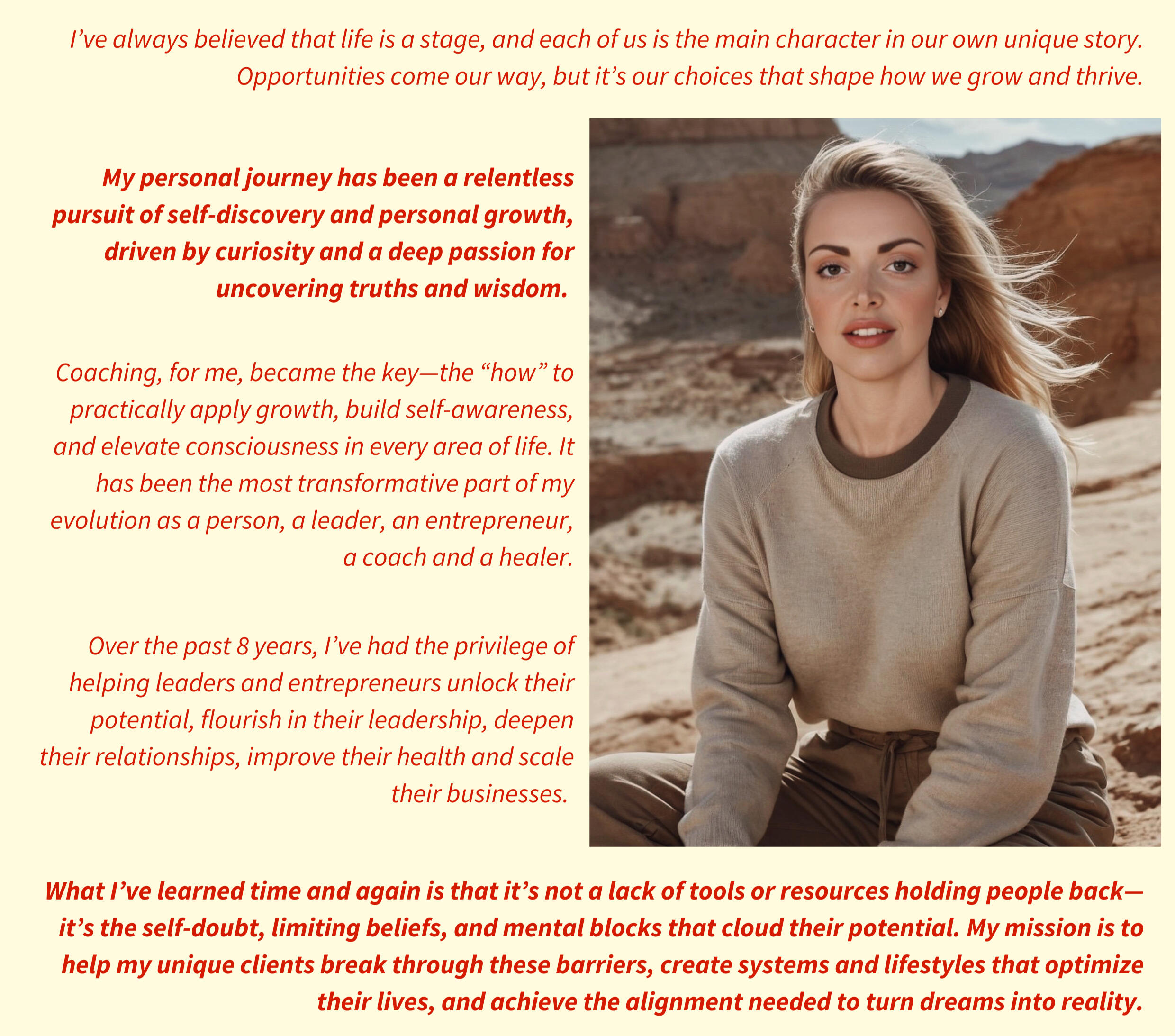 They’re tired of feeling stuck in a cycle where life feels fine but not truly fulfilling. They’re searching for personal growth, life clarity, and the tools to unlock their best selves.They feel the spark of untapped potential, a deep desire to create a life that’s meaningful, impactful, and aligned with their purpose. They dream of looking back and saying,