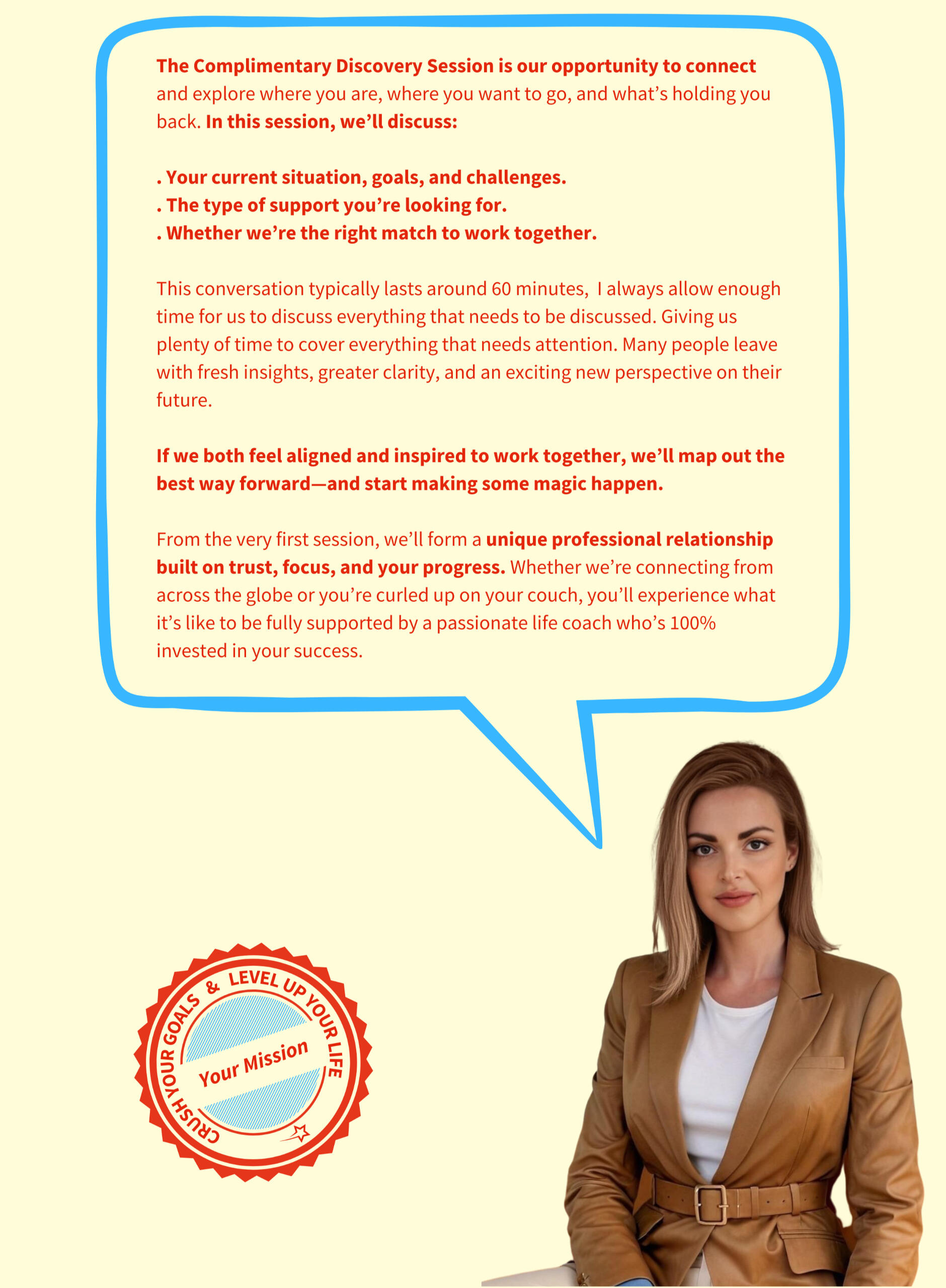 Book a free discovery session with me to explore your goals, identify challenges, and create a roadmap for meaningful personal and professional growth.This session is your chance to see how coaching can help you unlock your potential and achieve the success you’ve been striving for. If we’re a great match, we’ll take the next step TOGETHER. 🤝✨I work with a select number of clients each year to ensure deeply personalized coaching and dedicated support.