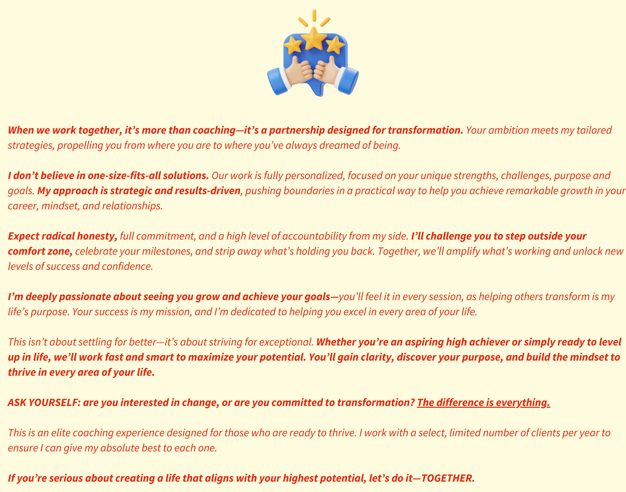 Most of my clients come to me because they’re ready for real transformation—ready to become the best version of themselves and achieve their full potential.
