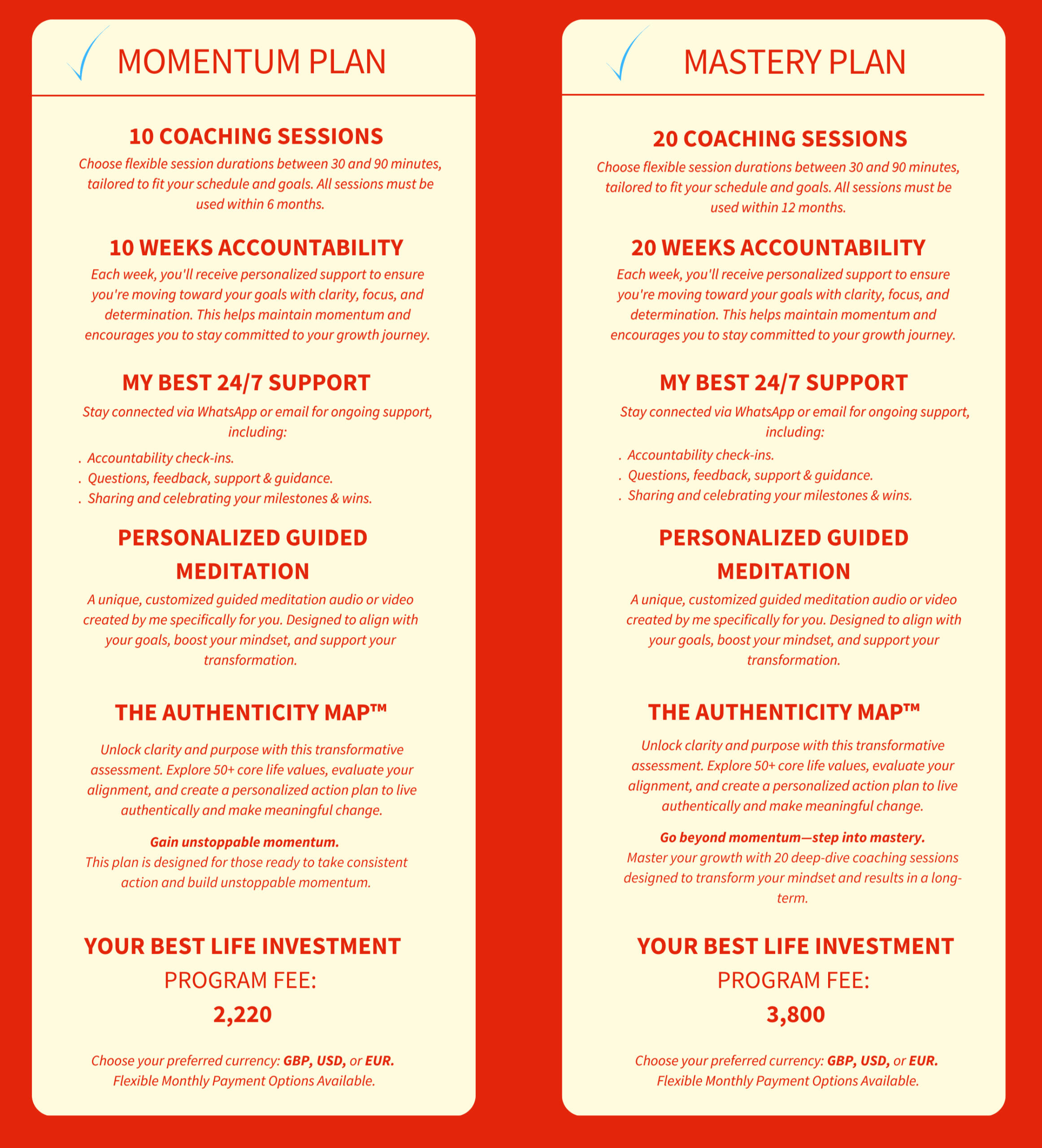 A structured coaching experience with ongoing support for long-term growth. Check all details of my packages available by clicking here.. Mastery Plan