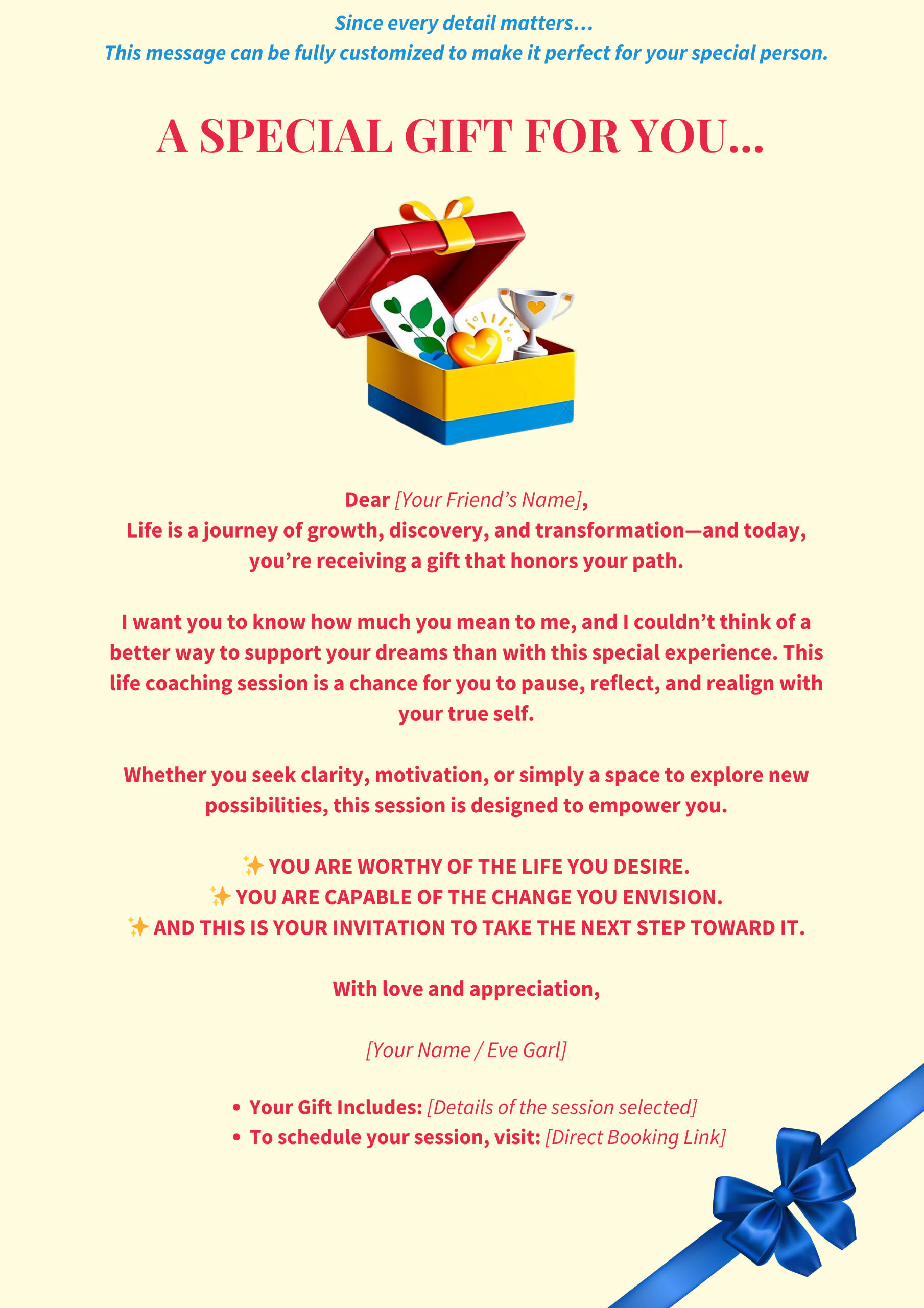 Share the power of coaching with a friend, partner, family member, or team member—because growth is even better when shared. 🔗 Click to See Gift Card Example.