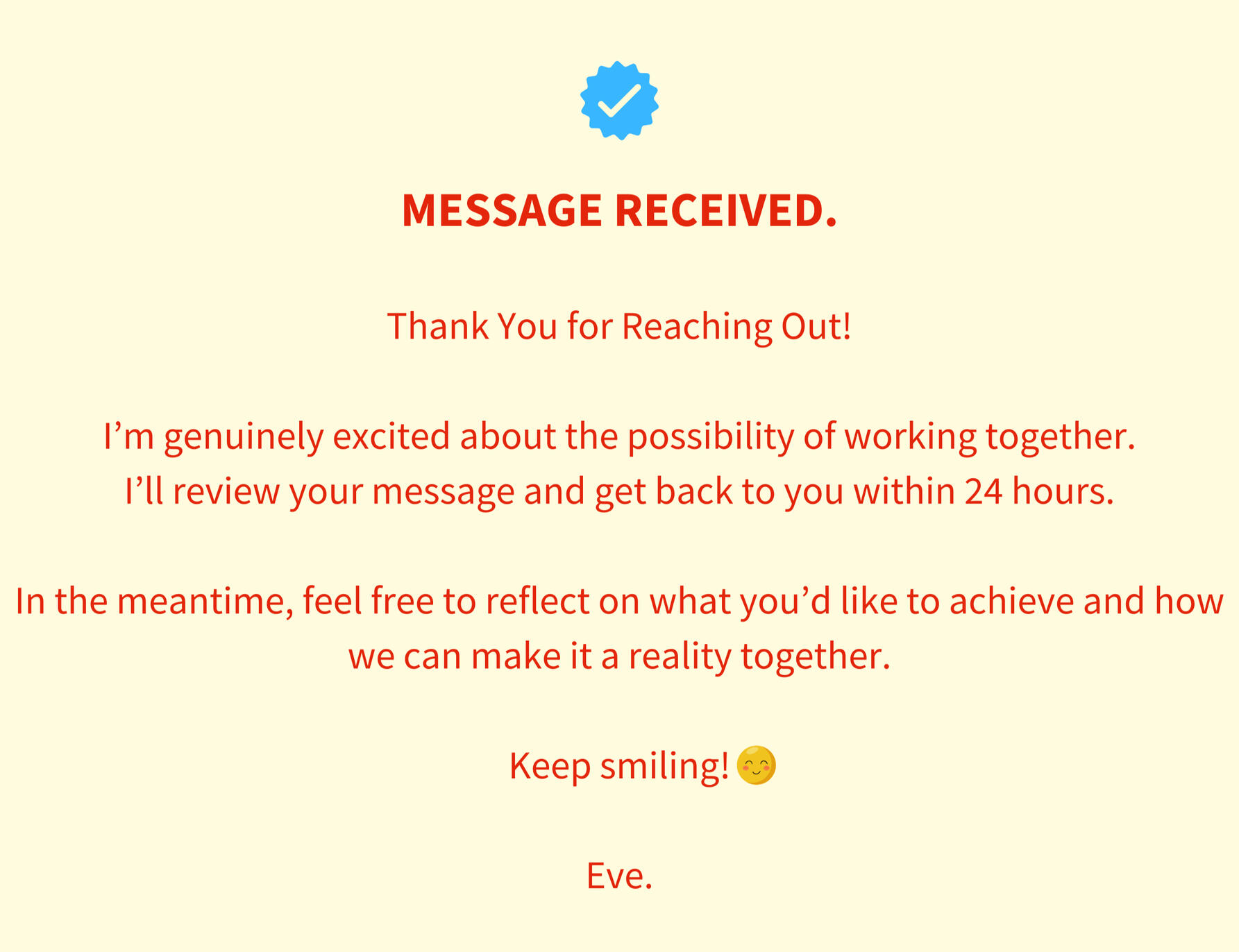 Send me a message with a brief outline of your goals, challenges, your general availability & time zone, and I´ll contact you within 24 hours to arrange your discovery session.Your journey to real, lasting change starts here.Fill in the form or reach out to [email protected] and I will personally answer within hours.